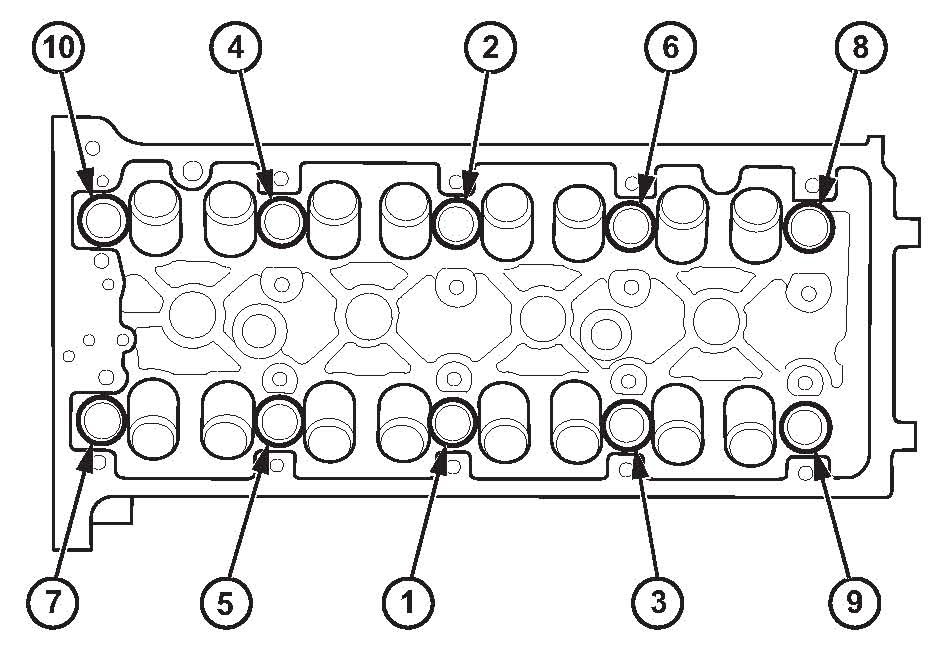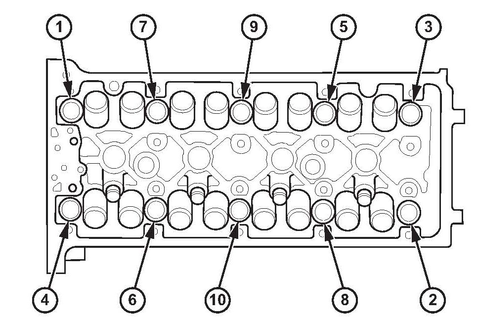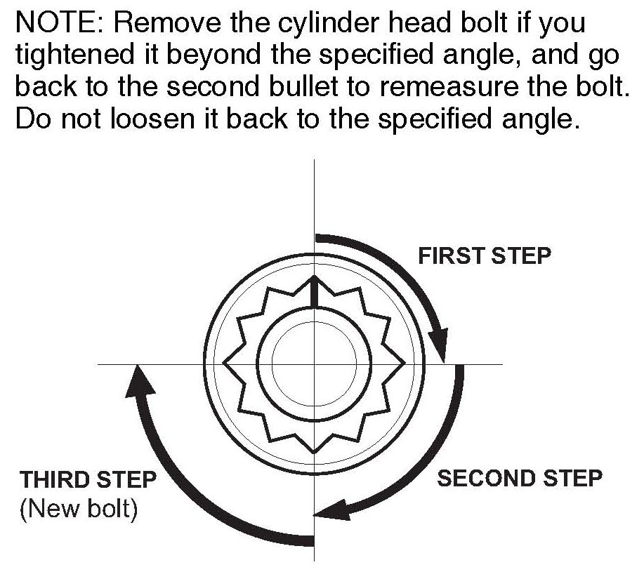 ^ After torquing, tighten all cylinder head bolts in two steps (900 per step) using the sequence shown above. If you are using a new cylinder head bolt, tighten the bolt an extra 90°.