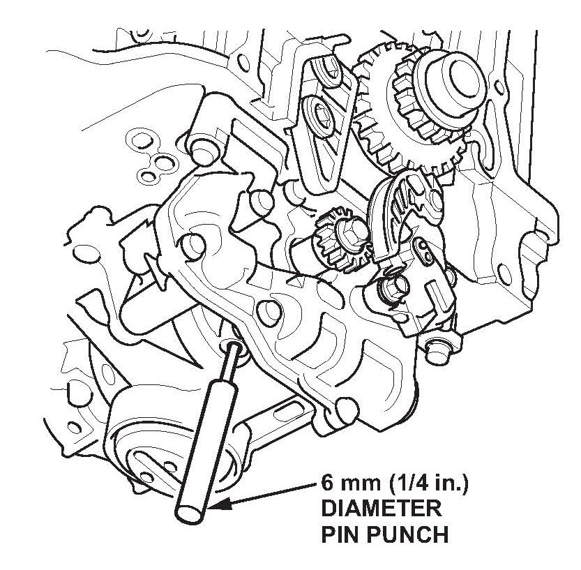 67. To hold the rear balancer shaft, insert the 6 mm (1/4 in.) diameter long pin punch into the maintenance hole in the balancer shaft holder and through the rear balancer shaft.