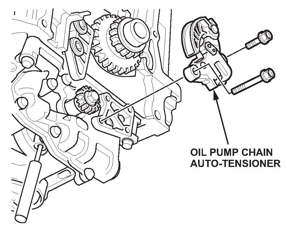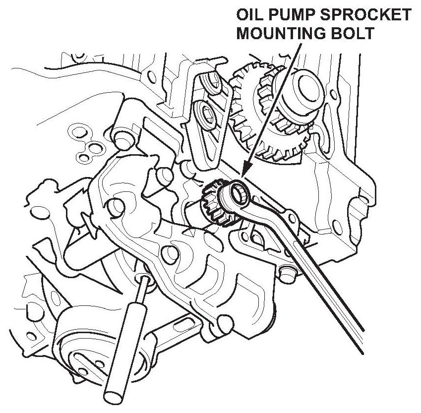 ^ Apply new engine oil to the threads of the oil pump sprocket mounting bolt, then install it and torque it to 44 N.m (33 lb-ft).