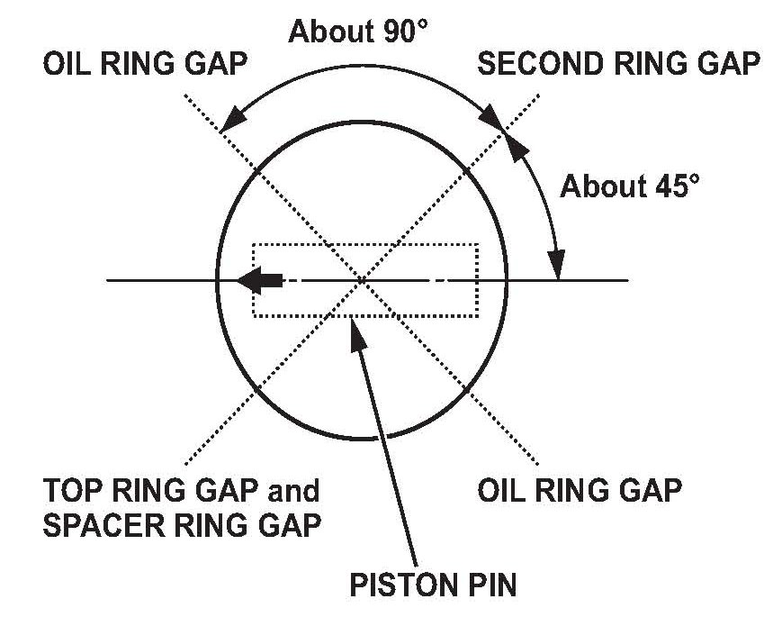 46. Turn the snap ring in the ring grooves until the end gaps are positioned at the bottom of the piston.