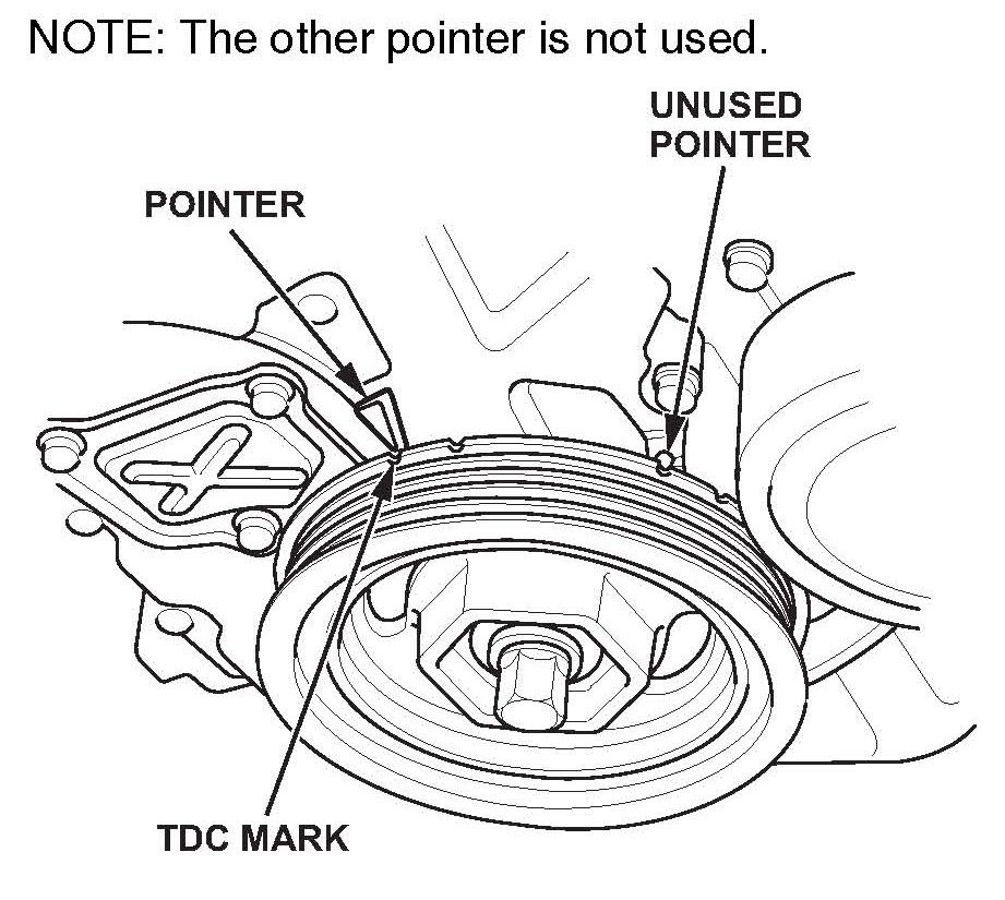 ^ Set the crankshaft to top dead center (TDC). Align the TDC mark on the crankshaft sprocket with the pointer on the engine block.