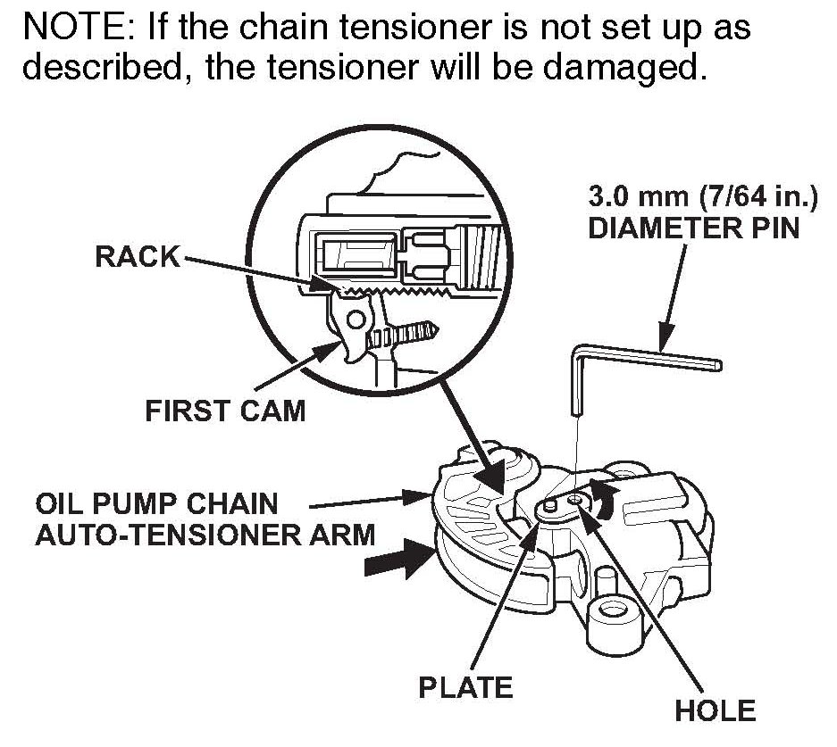 68. Turn the oil pump auto-tensioner plate counterclockwise to release the lock, then push the auto-tensioner arm, and set the first cam to the first edge of the rack. Insert a 3.0 mm (7/64 in.) diameter pin into the hole.
