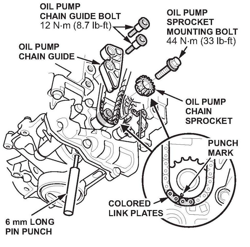 ^ Install the oil pump chain on the crankshaft sprocket with the colored link plate aligned with the TDC mark on the crankshaft sprocket.