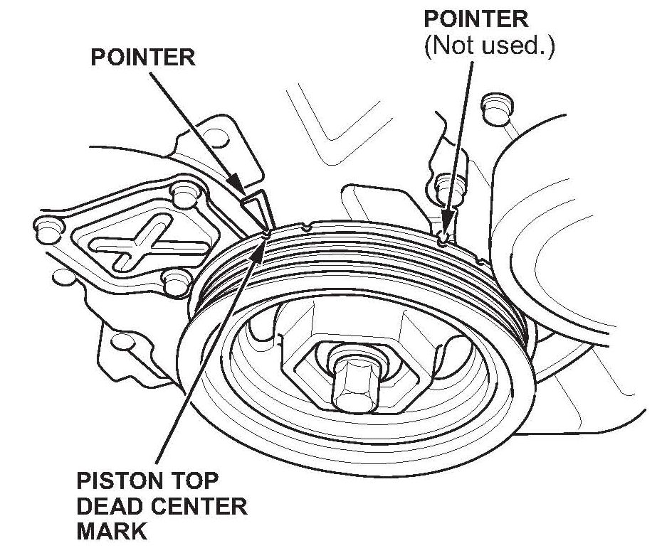 2. Rotate the crankshaft pulley so the top dead center (TDC) mark lines up with the pointer.