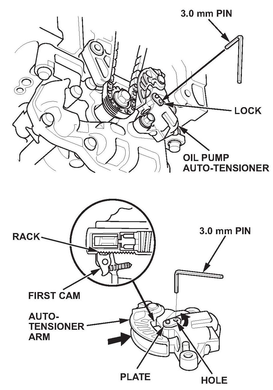 8. Align the holes on the oil pump auto-tensioner cam lock and the oil pump chain auto-tensioner, then insert a 3 mm diameter pin into the hole. Turn the crankshaft clockwise to secure the pin.