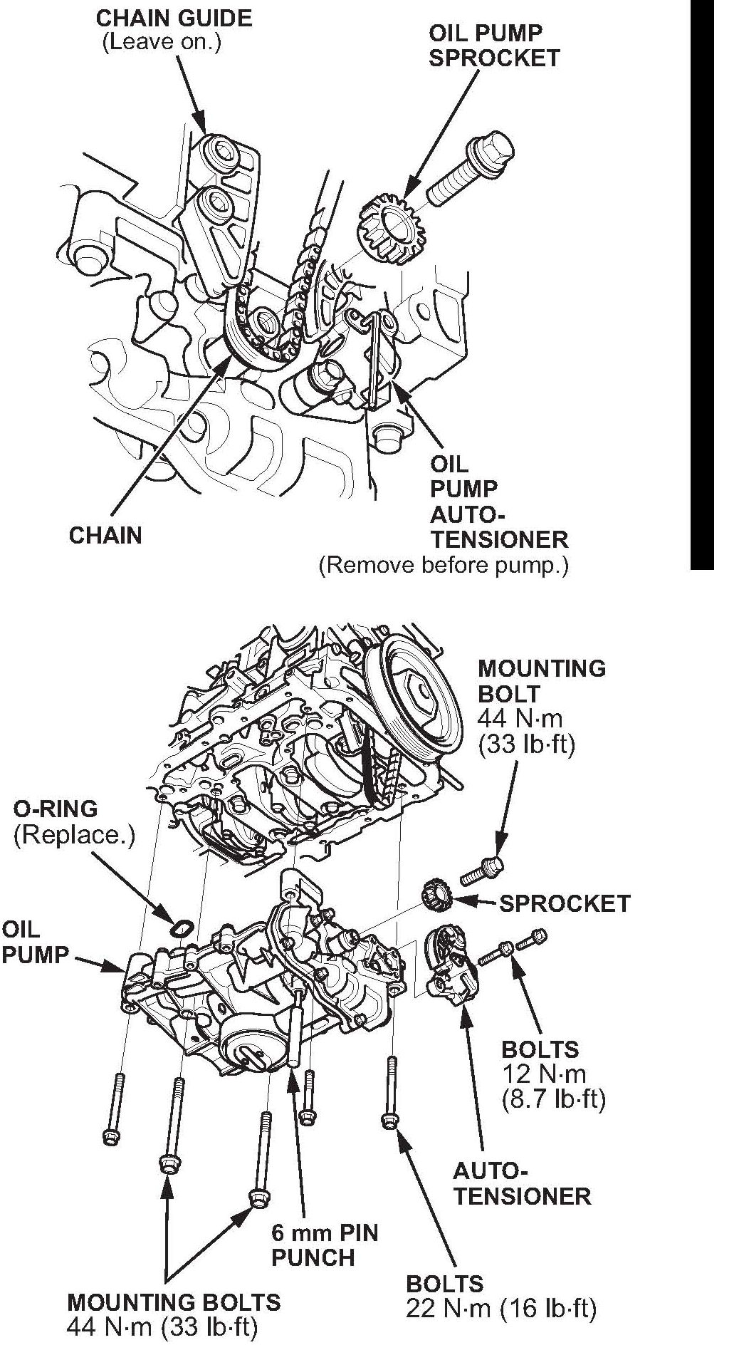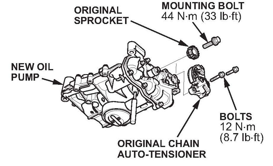 *10. Loosen the oil pump chain auto-tensioner bolts, then remove the oil pump sprocket, the oil pump chain auto-tensioner, and the oil pump.*