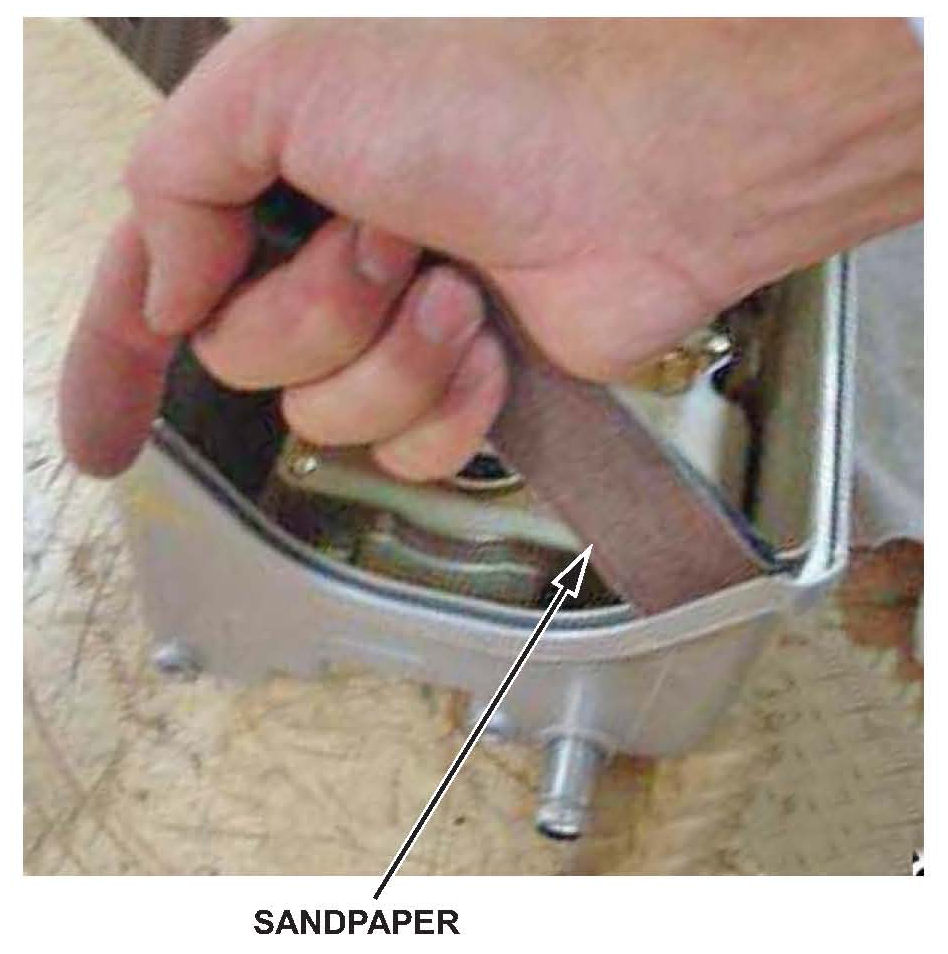 3. Wrap a 1-1/2-inch-wide strip of 120 grit sandpaper around the putty spreader tool. Insert it into the cylinder head cover gasket groove where there is paint overspray. Sand the groove until the paint overspray is removed.