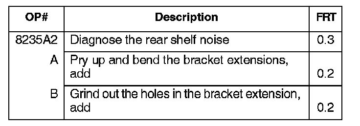 ^ If the noise is coming from the rear shelf, open the trunk, look through the hole next to the trunk light, and check the rear shelf's middle mounting hook for felt tape. If there is no felt tape, see Service Bulletin 08-083, Hear Shelf Rattles When the Vehicle Is Driven on Rough Roads.