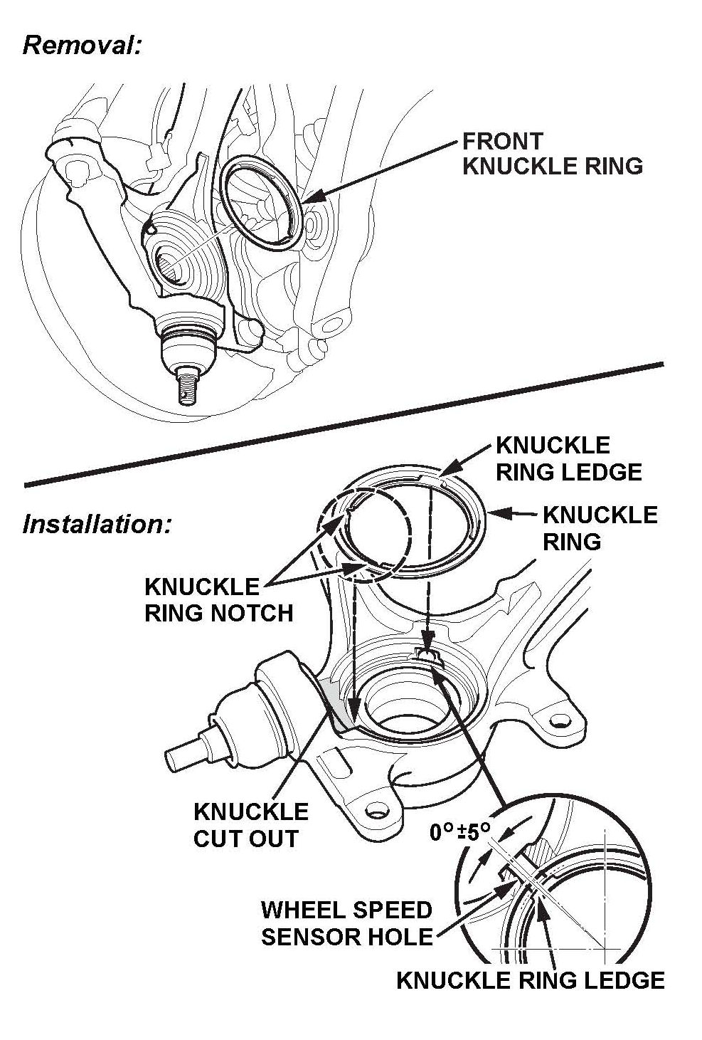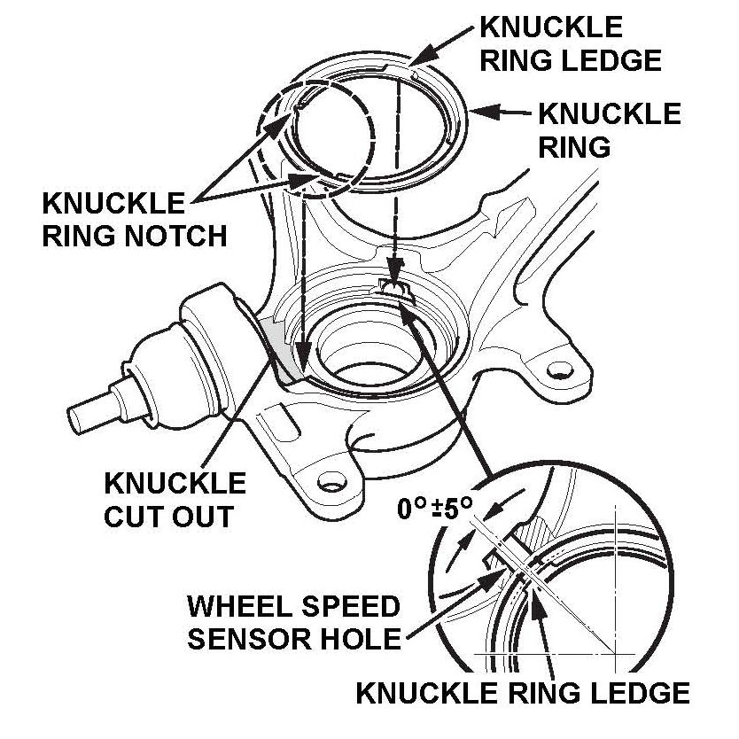 Position the knuckle ring notch portion toward the cut out near the ball joint in the knuckle, and align the center of the knuckle, and align the center of the knuckle ring ledge portion with the center of the wheel speed sensor hole on the knuckle.