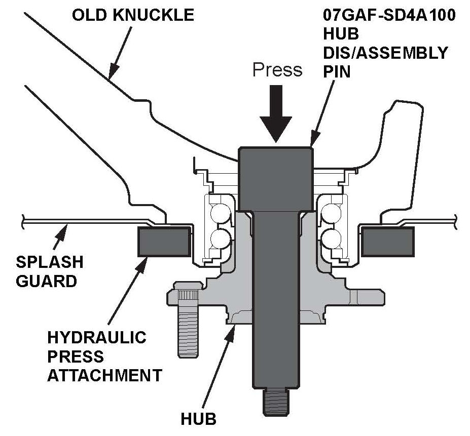17. Separate the hub from the old knuckle using the hub dis/assembly pin and a hydraulic press. Hold the knuckle with the hydraulic press attachment or equivalent tool. Be careful not to damage or deform the splash guard. Hold onto the hub to keep it from falling when pressed clear.