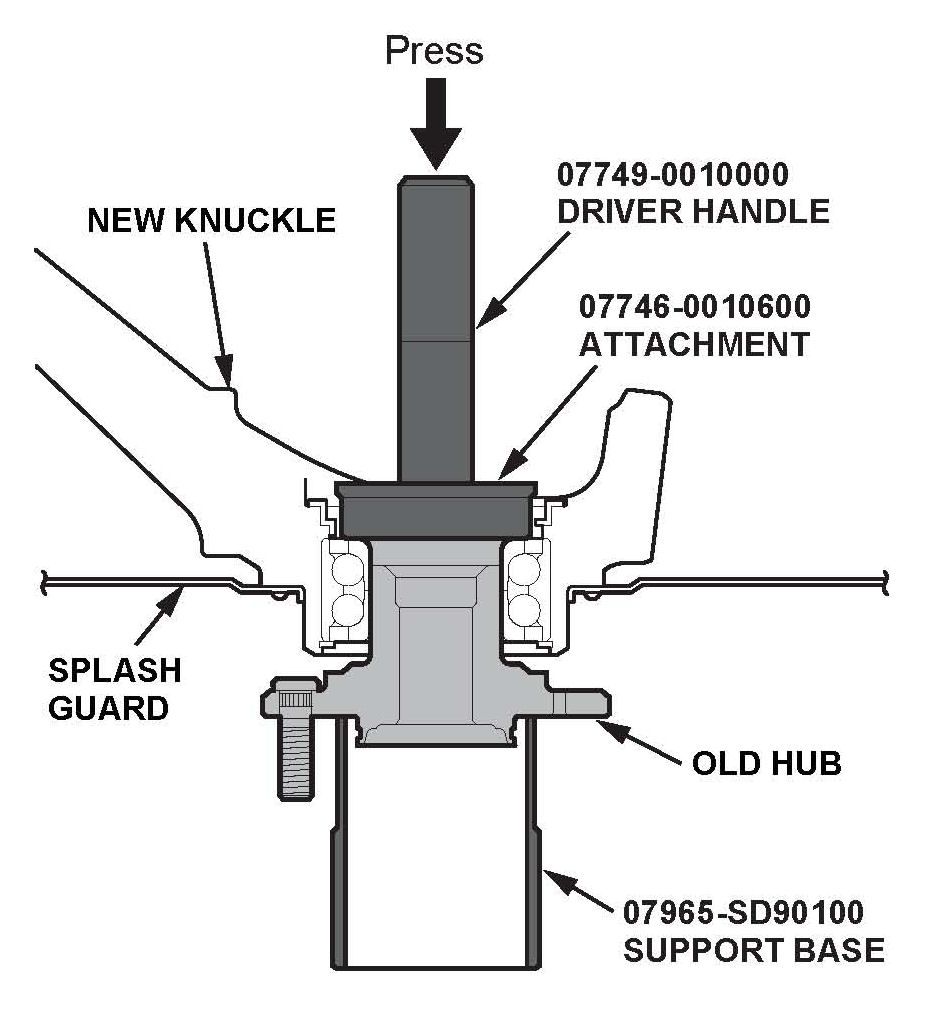 25. Install the hub onto the new knuckle assembly using the driver handle, the attachment, the support base, and a hydraulic press. Be careful not to damage the splash guard.
