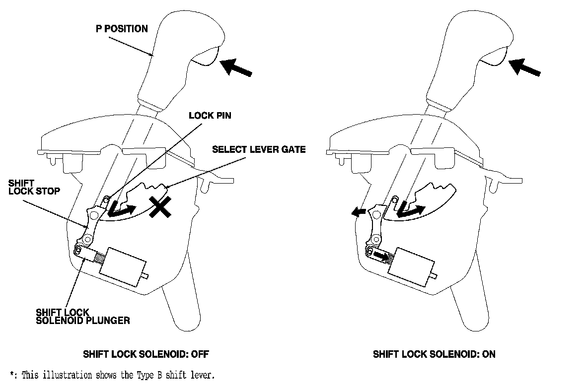 The shift lock system prevents the shift lever from mis-shifting. The shift lock solenoid is usually OFF. After starting the engine in P, the shift lever cannot move to any other position from P because the shift lock stop stops the lock pin unless the brake pedal is pressed. When the brake pedal is pressed and the accelerator pedal is not pressed, the shift lock solenoid is ON; the shift lock solenoid plunger in the shift lock solenoid pulls the shift lock stop to release the lock pin. Pressing the shift lever button, allows the shift lever to move to any other position. When the brake pedal and the accelerator pedal are pressed at the same time, the shift lock system is not unlocked.
