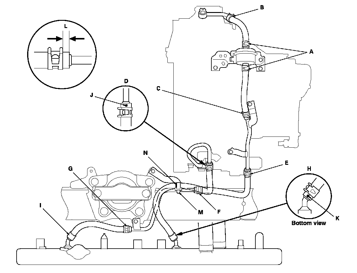 2. Secure the ATF cooler hose with the clamp (M) at the pink paint line (N).