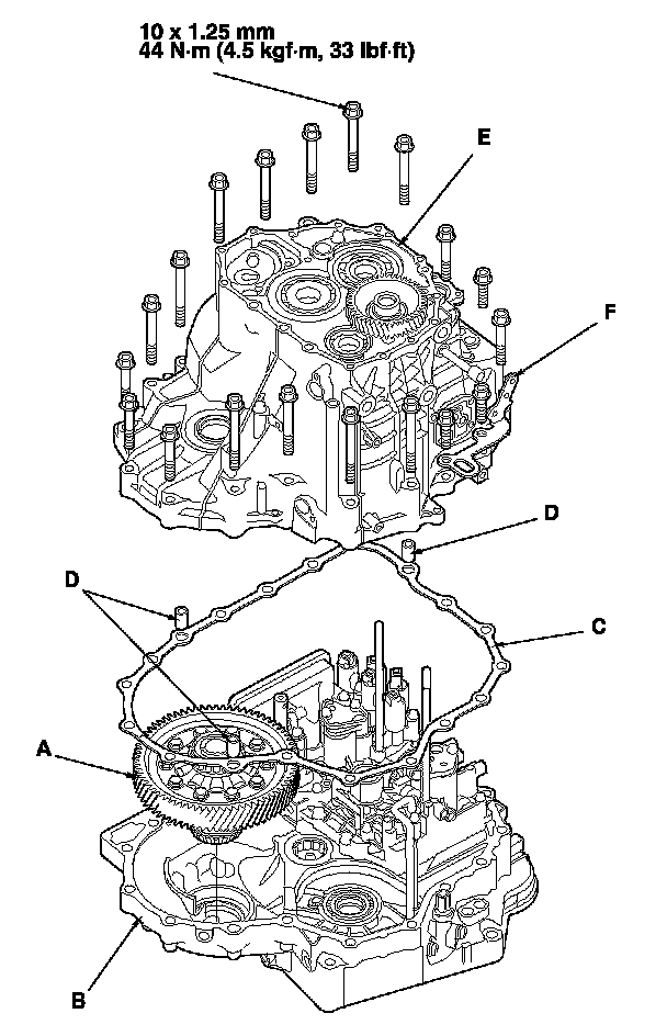 6. Install the transmission housing (E) and the transmission hanger (F), then tighten the bolts.