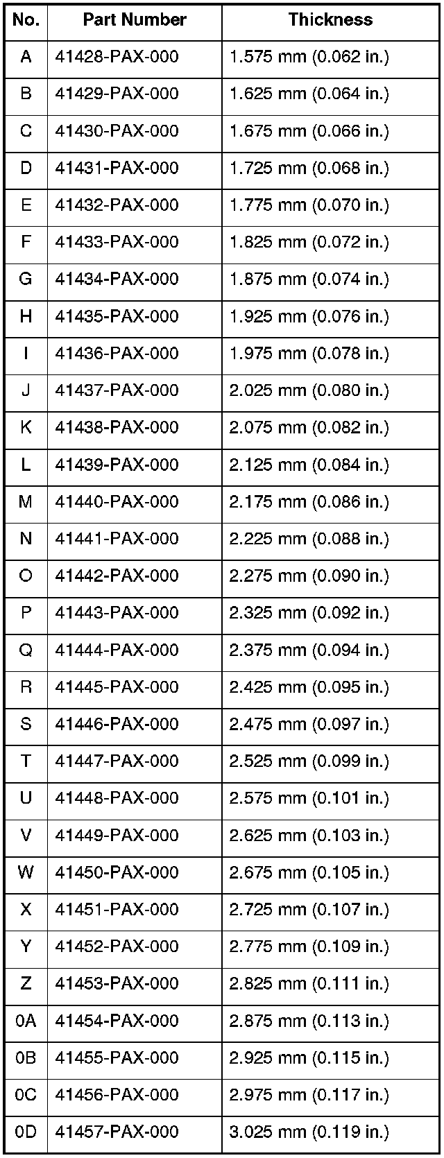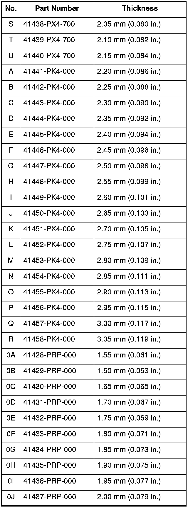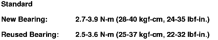 9. If the starting torque is out of standard, remove the 76 mm thrust shim and select a 76 mm thrust shim from the following table. Install a new 76 mm thrust shim and recheck. To increase the starting torque, increase the thickness of the 76 mm thrust shim. To decrease the starting torque, decrease the thickness of the 76 mm thrust shim. Changing the 76 mm thrust shim to the next size will increase or decrease starting torque about 0.3-0.4 N-m (3-4 kgf-cm, 2-3 lbf-in.).