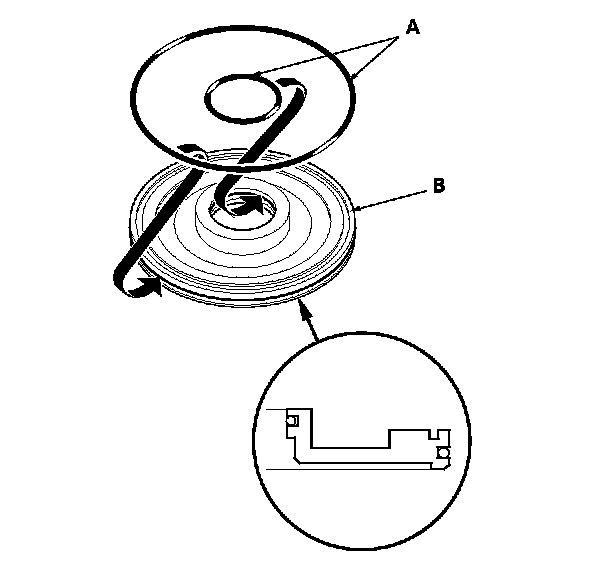 3. Install the clutch piston (A) in the clutch drum (B) while applying pressure and rotating to ensure proper seating. Do not pinch the O-ring.