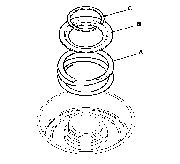 4. Set the return spring (A) and spring retainer (B) on the clutch piston, and position the snap ring (C) on the spring retainer.
