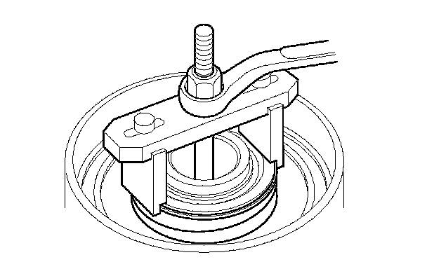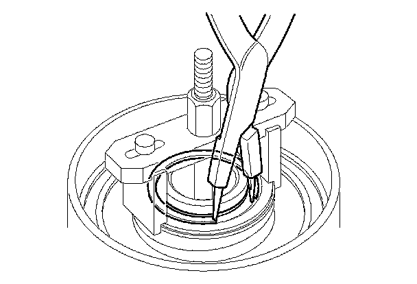 7. Check the placement of the clutch spring compressor attachment. If either end of the clutch spring compressor attachment is set over an area of the spring retainer that is unsupported by the return spring, the retainer may be damaged.