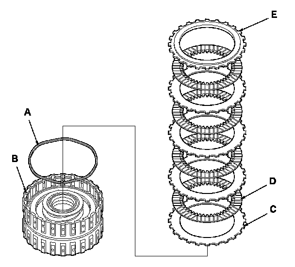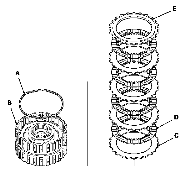 11. Install the wave spring (A) in the 4th clutch drum (B). Starting with the clutch wave-plate, alternately install the wave-plates (C) (4) and the clutch discs (D) (4). Install the clutch end-plate (E) with the flat side toward the top disc.
