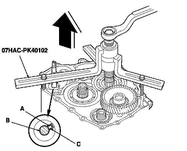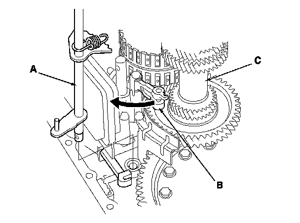 6. Align the spring pin (A) on the selector control shaft (B) with the transmission housing groove (C) by turning the selector control shaft with the selector control lever.
