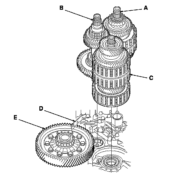 14. Remove the mainshaft subassembly (A), the countershaft subassembly (B) and the secondary shaft subassembly (C) together. Do not bump the countershaft on the baffle plate (D).
