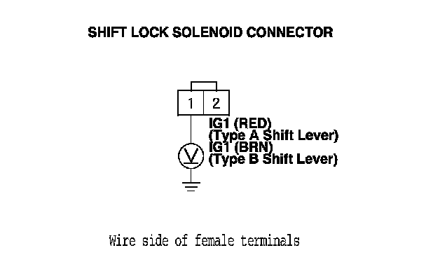 11. Release the brake pedal, and measure the voltage between shift lock solenoid connector terminals No. 1 and No. 2. The shift lever must be in P.