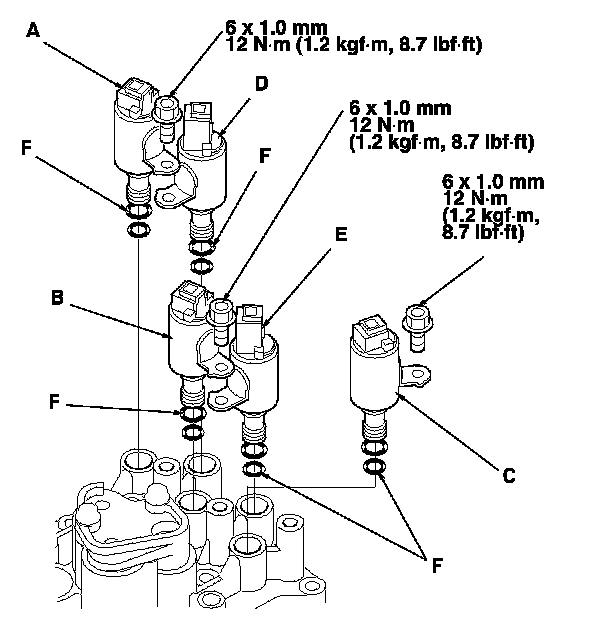 2. Install new O-rings (two O-rings per shift solenoid valve) (F) on the shift solenoid valves.