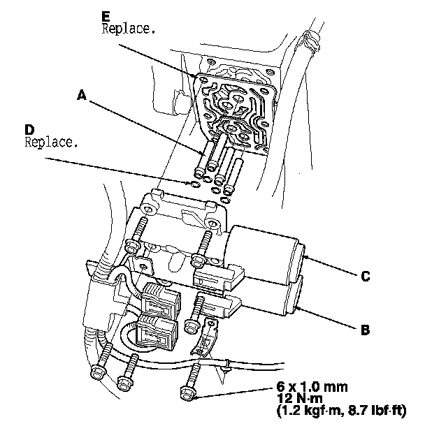 14. Disconnect one of the jumper wires, and check the valve movement at the fluid passage in the valve body mounting surface. If the valve binds or moves sluggishly, or if the solenoid valve does not operate, replace A/T clutch pressure control solenoid valves B and C.