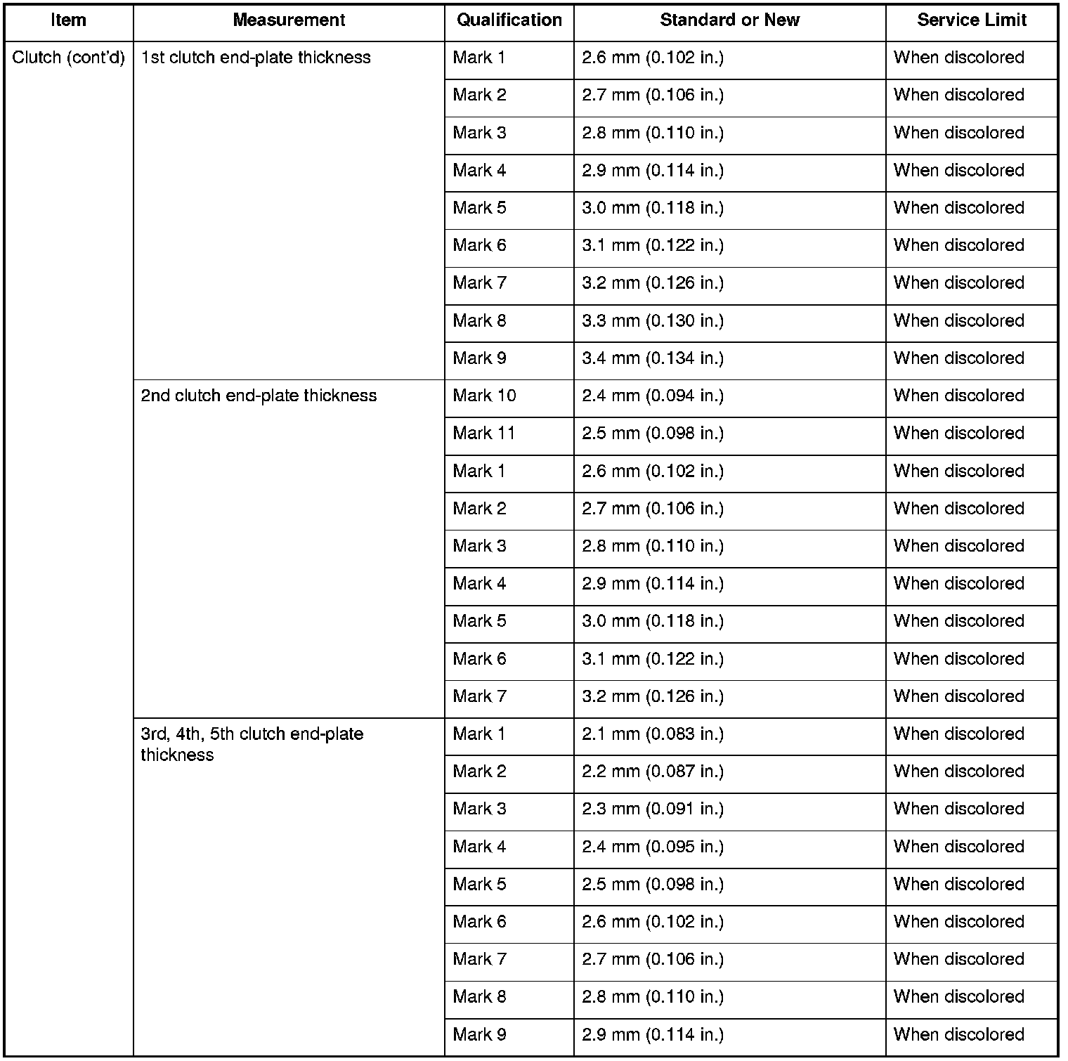 Clutch (cont'd) Specifications
