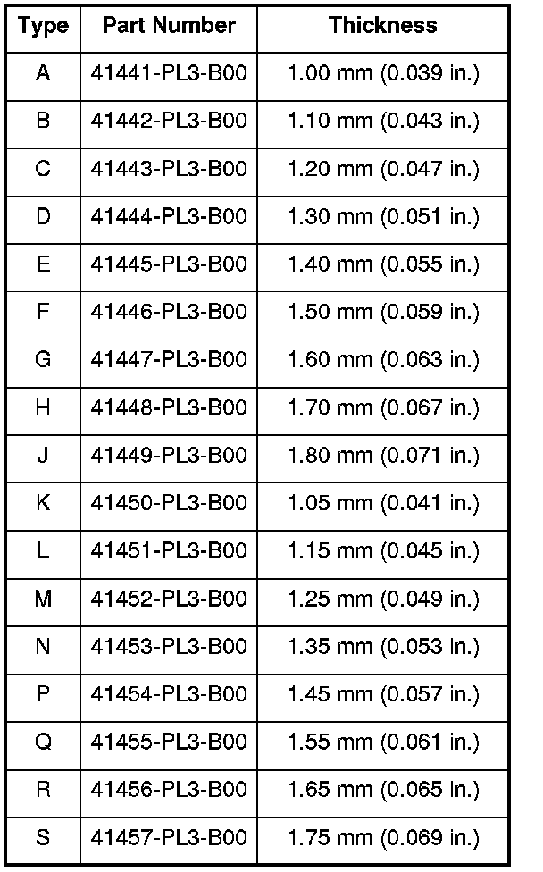 7. If the clearance exceeds the standard, select a new 80 mm shim from the following table. If the clearance measured in step 6 is within the standard, go to step 10.