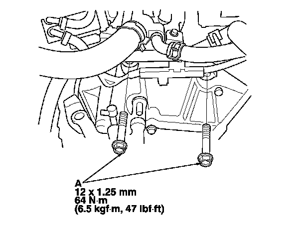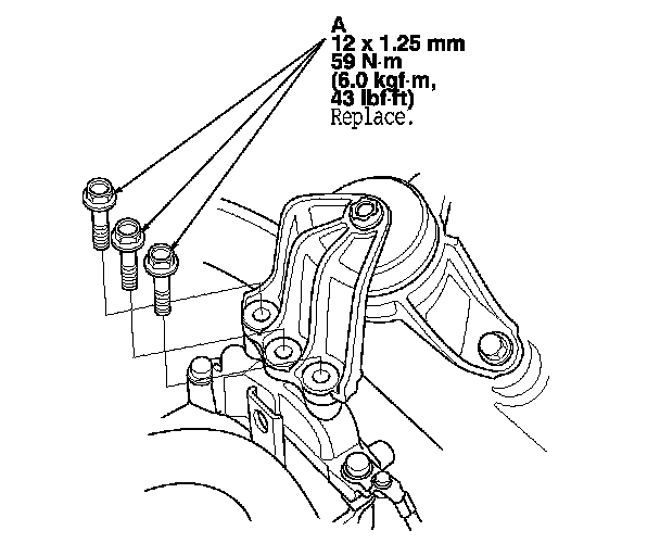 9. Install the lower transmission mount (A) with new bolts, then remove the transmission jack.