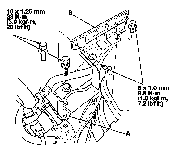 34. Install the upper transmission mount bracket (A) with new bolts, and connect the ground cable (B) by installing its mounting bolt.