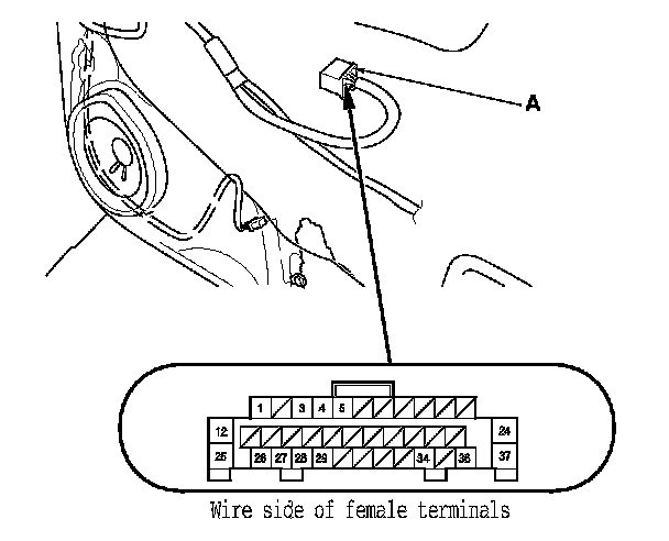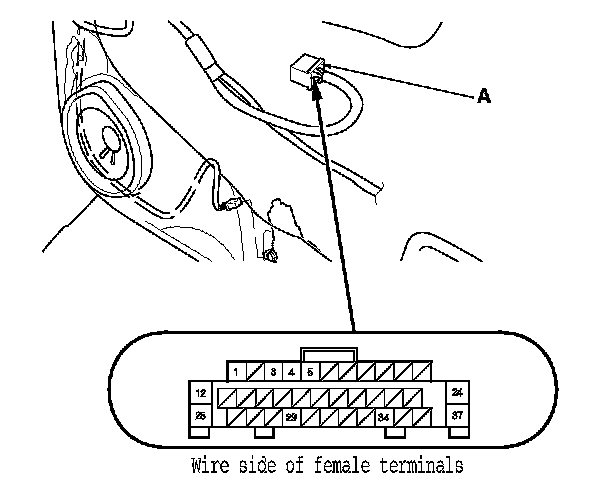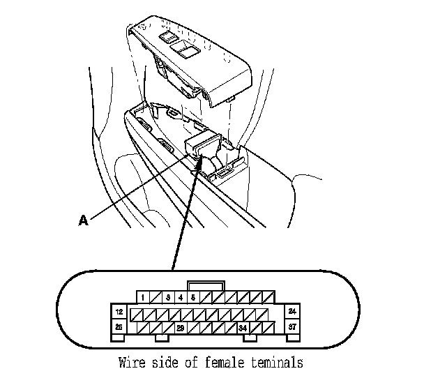 2. Test the motor in each direction by connecting battery power and ground to the front passenger's power window switch 37P connector (A) according to the table.