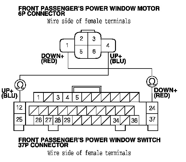 6. Check for continuity between the front passenger's power window switch 37P connector terminals and front passenger's power window motor 6P connector terminals as shown: