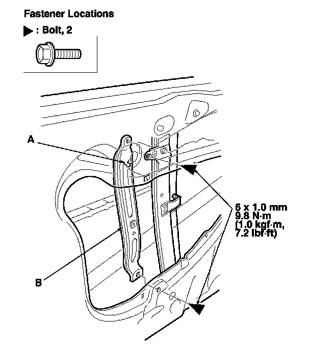 5. 4-door: Remove the bolts, and release the hook (A), then remove the door panel bracket (B).