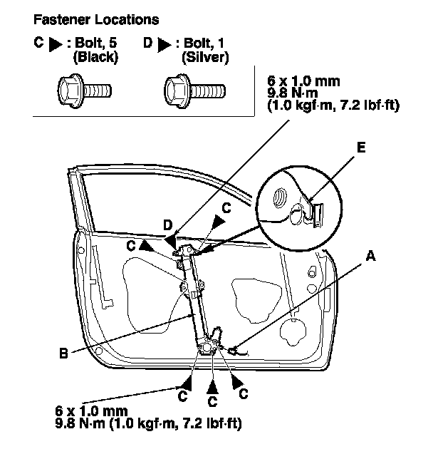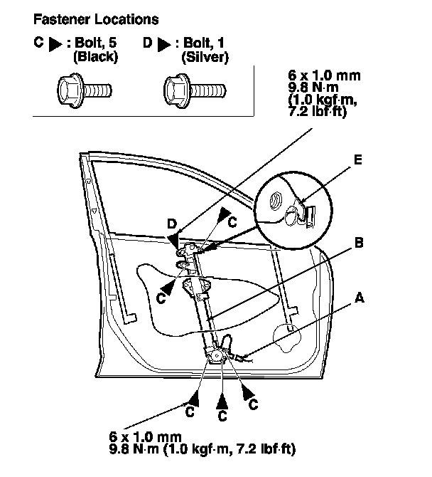 8. Remove the bolts (C), and loosen the bolts (D). Release the hook (E), then remove the regulator through the hole in the door.