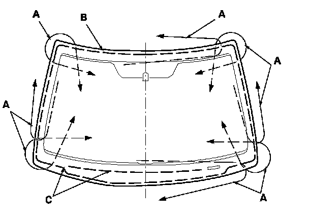18. With a sponge applicator, apply a light coat of glass primer to the windshield (A) along the edge of the molding (B) and rubber dams (C) as shown, then lightly wipe it off with gauze or cheesecloth:
