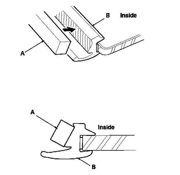 2. Remove the molding (A) from the upper edge of the windshield (B). If necessary, cut the molding with a utility knife.