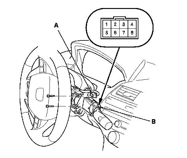 2. Disconnect the dashboard wire harness 8P connector (A) from the wiper/washer switch (B).