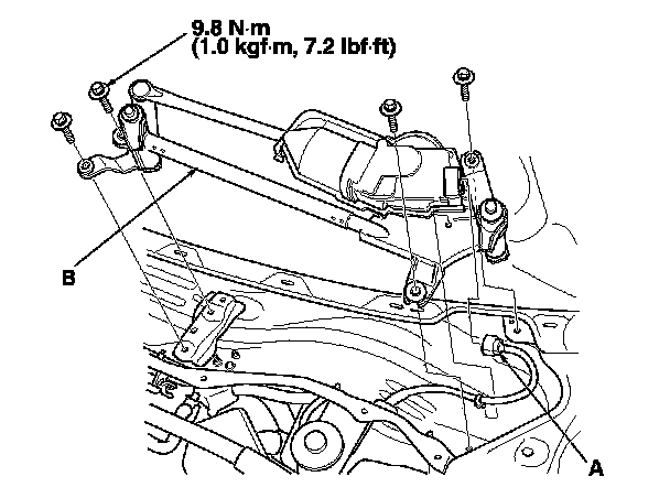 6. Remove the four bolts and wiper linkage assembly (B).