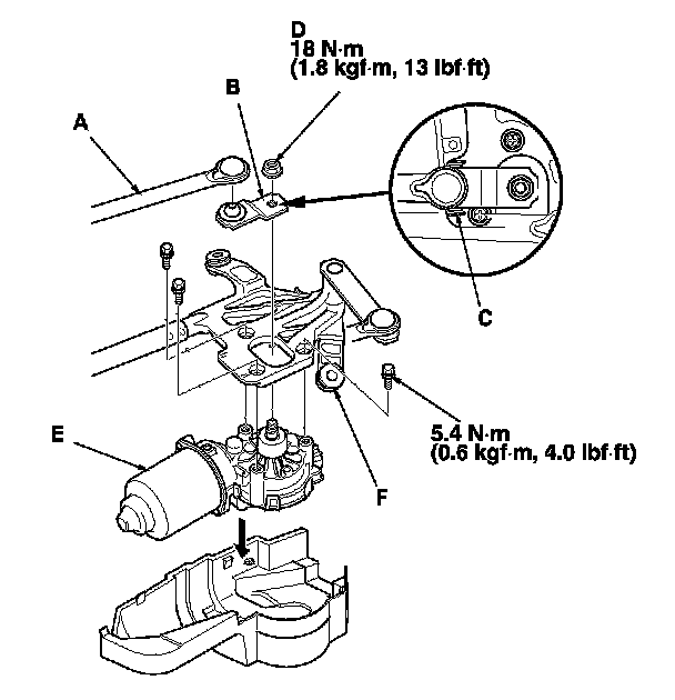 9. Remove the three bolts, and separate the wiper motor from the linkage (F).