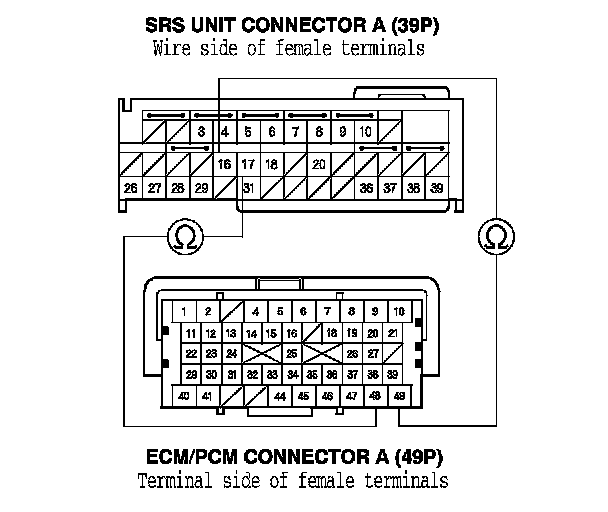 10. Check for continuity between the terminal No. 16 of the SRS unit connector A (39P) and the terminal No.49 of the ECM/PCM connector E (49P), and between the terminal No. 17 of the SRS unit connector A (39P) and the terminal No. 48 of the ECM/PCM connector (49P).