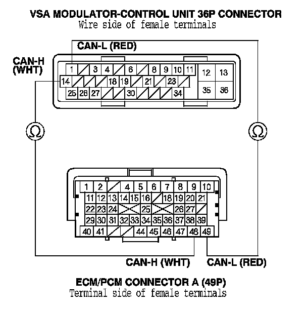 9. Check for continuity between the VSA modulator-control unit 36P connector terminal and ECM/PCM connector A (49P) terminal (see table).