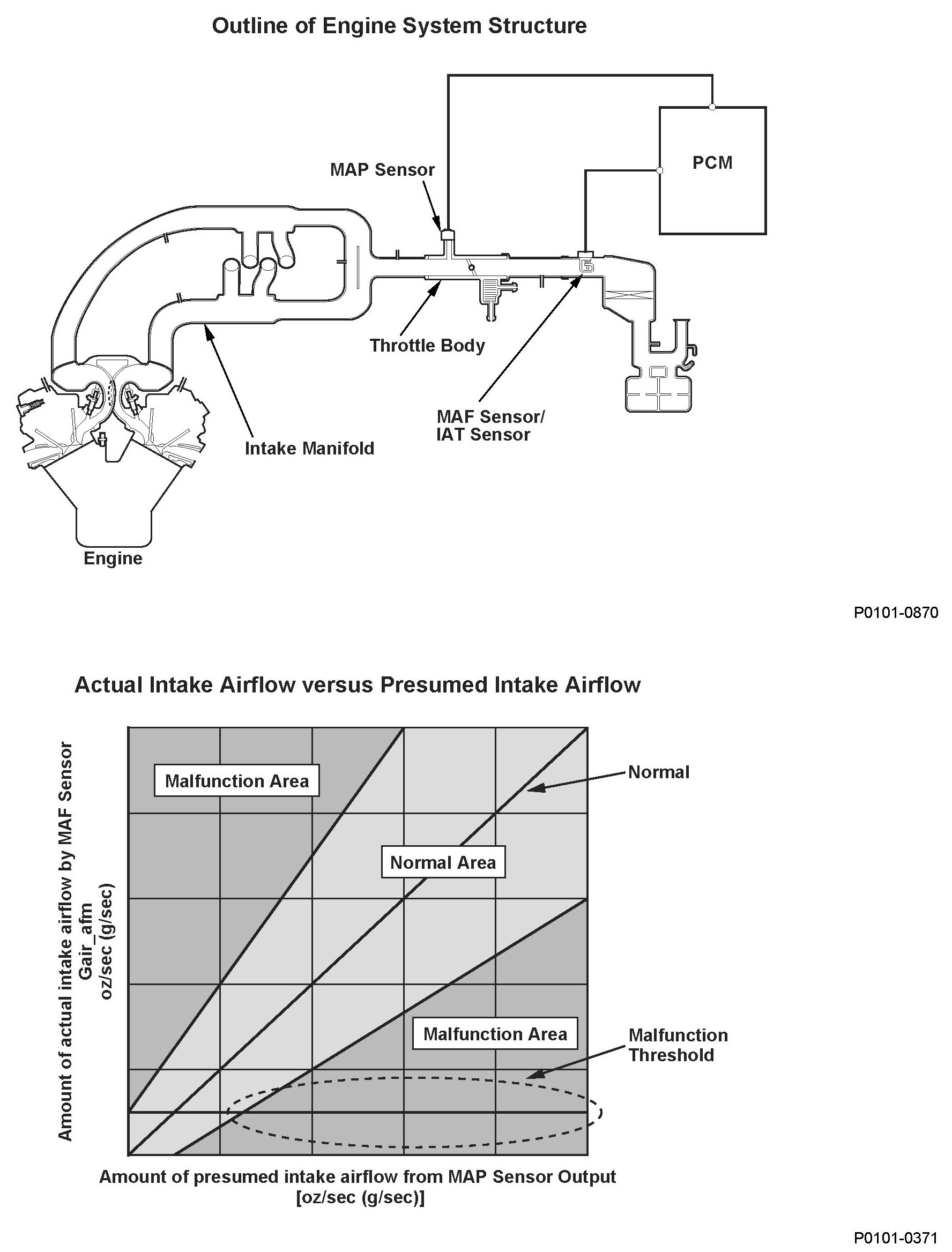The mass airflow (MAF) sensor directly measures the amount of intake airflow into the engine, and the powertrain control module (PCM) controls the fuel injection based on the measured value. The manifold absolute pressure (MAP) sensor measures the intake manifold pressure and the PCM calculates the amount of intake airflow from the MAP sensor output and the engine revolutions. The PCM compares the MAF sensor output (amount of intake airflow) and the amount of intake airflow calculated from MAP sensor output. If their difference is too large (in the malfunction area), the PCM detects a malfunction and a DTC is stored.
