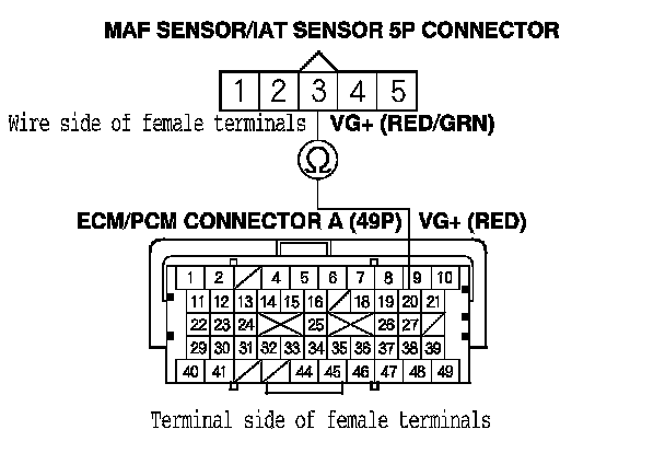 12. Check for continuity between MAF sensor/IAT sensor 5P connector terminal No. 3 and ECM/PCM connector terminal A20.
