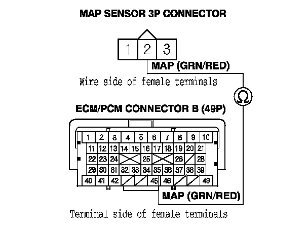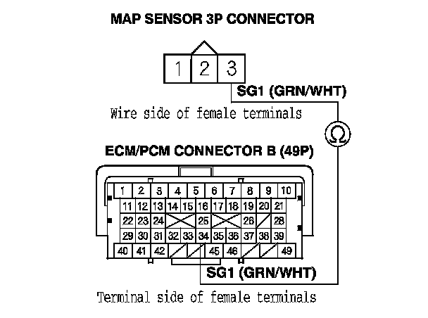13. Check for continuity between ECM/PCM connector terminal B34 and MAP sensor 3P connector terminal No. 3.