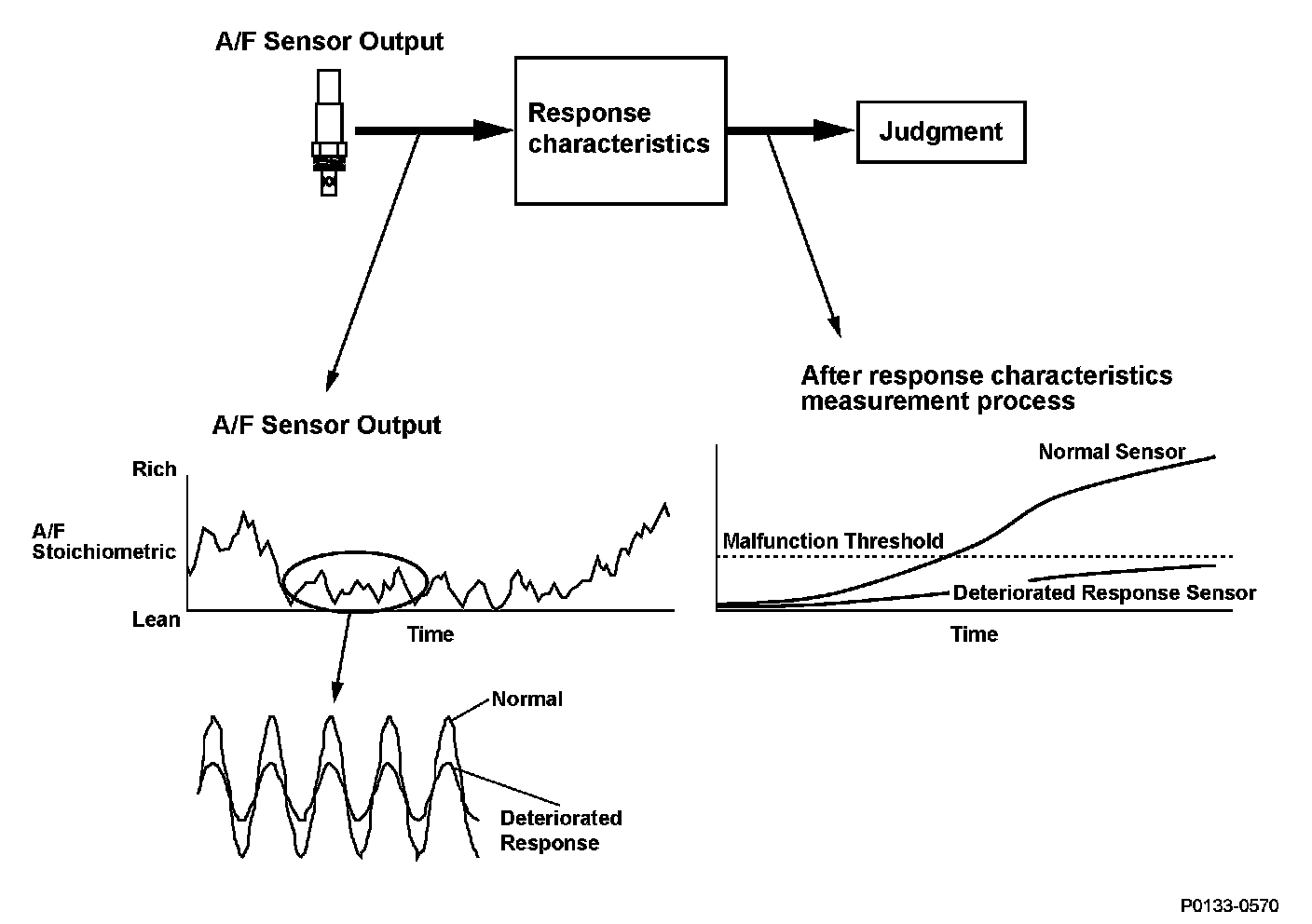 The front air/fuel ratio (A/F) sensor (bank 2, sensor 1) has a linear signal output in relation to the oxygen concentration. The powertrain control module (PCM) computes the air/fuel ratio from the front A/F sensor output voltage and uses fuel feedback control to improve exhaust emissions. The PCM compares the response characteristics against the front A/F sensor output, and if the accumulated value within the specified time is less than the specified value, it detects a deteriorated response and stores a DTC.