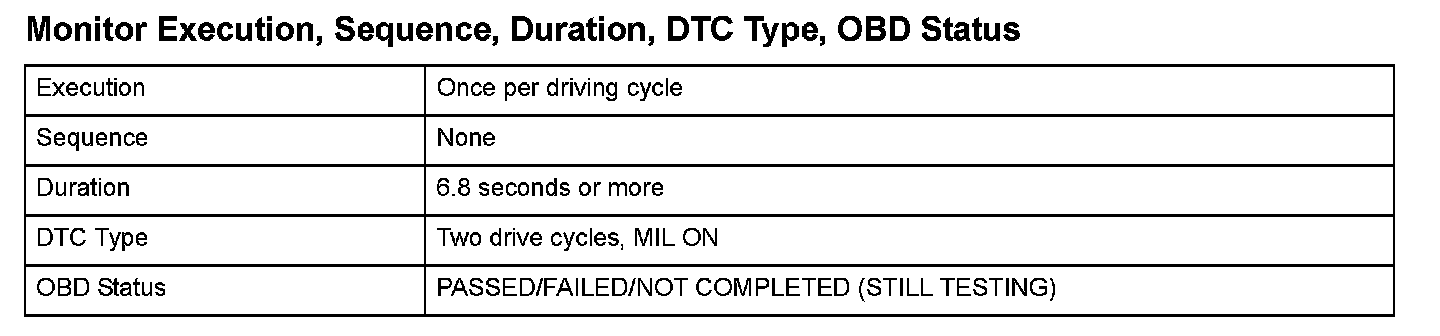 Monitor Execution, Sequence, Duration, DTC Type, OBD Status