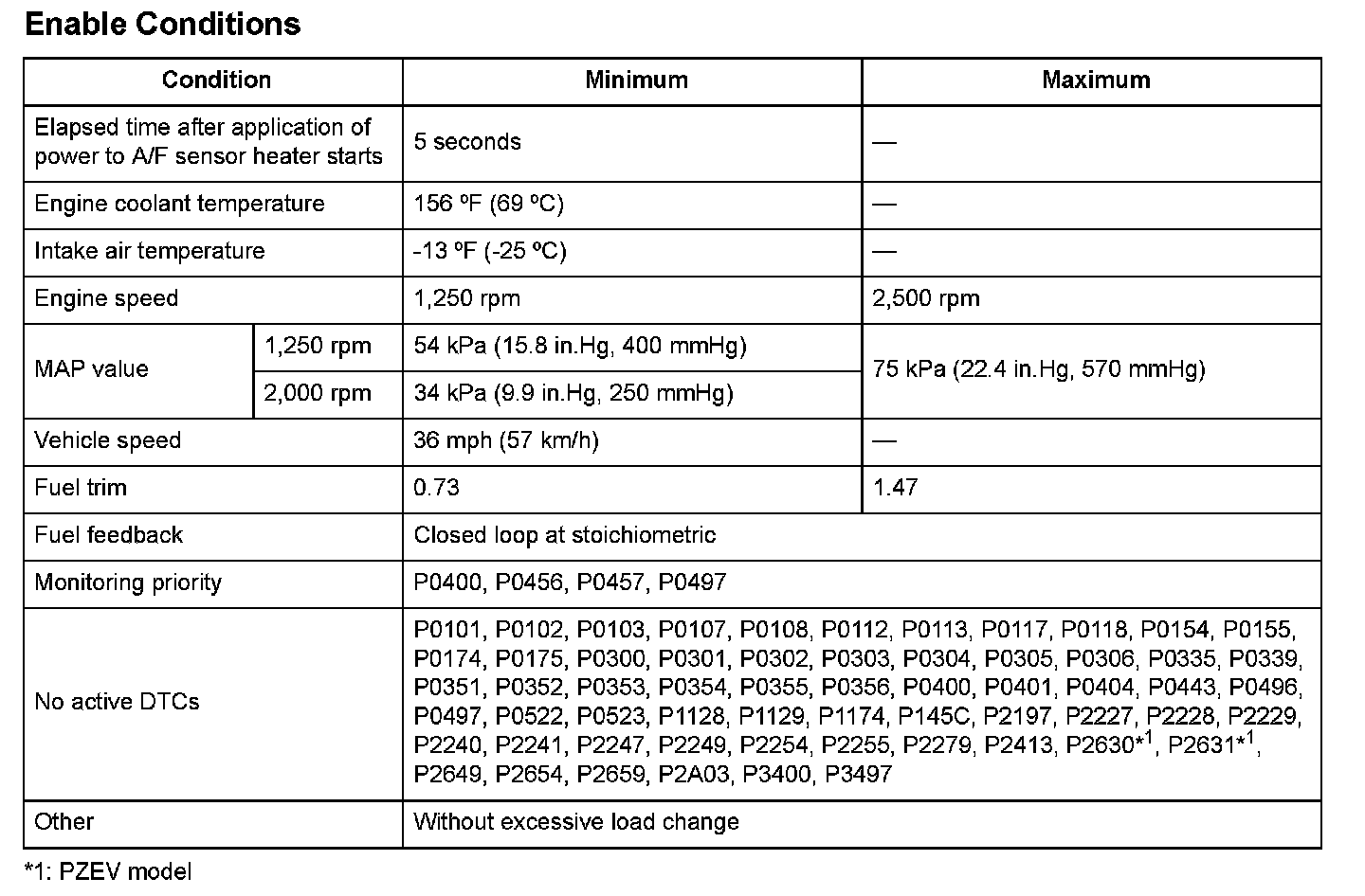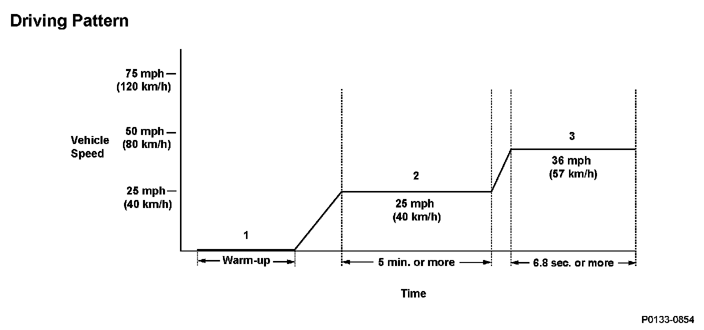 3. Then, drive immediately at a steady speed of 36 mph (57 km/h) or more and engine speed between 1,250 - 2,500 rpm for at least 6.8 seconds.