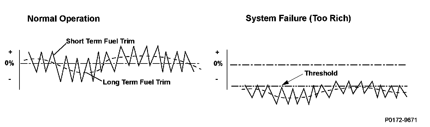 The engine control module (ECM) detects the oxygen content in the exhaust gas from the rear air/fuel ratio (A/F) sensor (bank 1, sensor 1) signal voltage, and it uses fuel feedback control to maintain the optimal air/fuel ratio. The air/fuel ratio coefficient for correcting the amount of injected fuel is the short term fuel trim. The ECM varies short term fuel trim continuously to keep the air/fuel ratio close to the stoichiometric ratio for all driving conditions. Long term fuel trim is computed from short term fuel trim and is used to regulate long term deviation from the stoichiometric air/fuel ratio, which occurs when fuel metering components deteriorate with age or system failures occur. In addition, long term fuel trim is stored in the ECM memory and is used to determine when fuel metering components malfunction. When long term fuel trim is higher than normal, which is about 1.0 (0 %), the amount of injected fuel must be increased, and when lower than normal, it must be decreased. If long term fuel trim is lower than normal (too rich), a malfunction in the fuel metering components is detected and a DTC is stored.